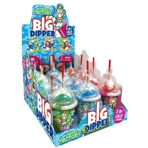 A tasty 2 in 1 Big Dipper, a fruity lollipop with flavoured sherbet. Each case contains three different flavour combinations for your customers to try.