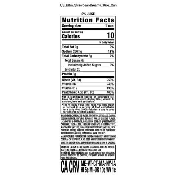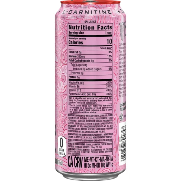 Carbonated Water, Erythritol, Citric Acid, Taurine, Sodium Citrate, Natural Flavors, Panax Ginseng Flavor, L-Carnitine L-Tartrate, Potassium Sorbate (Preservative), Caffeine, Sucralose, Sodium Benzoate (Preservative), Niacinamide (Vit. B3), D-Calcium Pantothenate (Vit. B5), Beta Carotene (Color), Inositol, Vegetable Juice Color, Pyridoxine Hydrochloride (Vit. B6), Cyanocobalamin (Vit. B12), Monster Energy Blend: Taurine, L-Carnitine, Caffeine, Inositol.