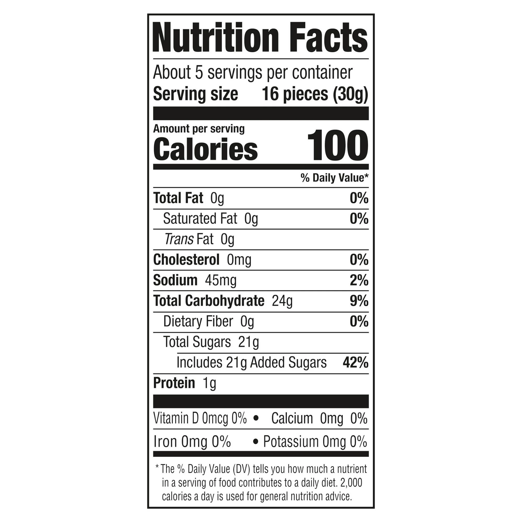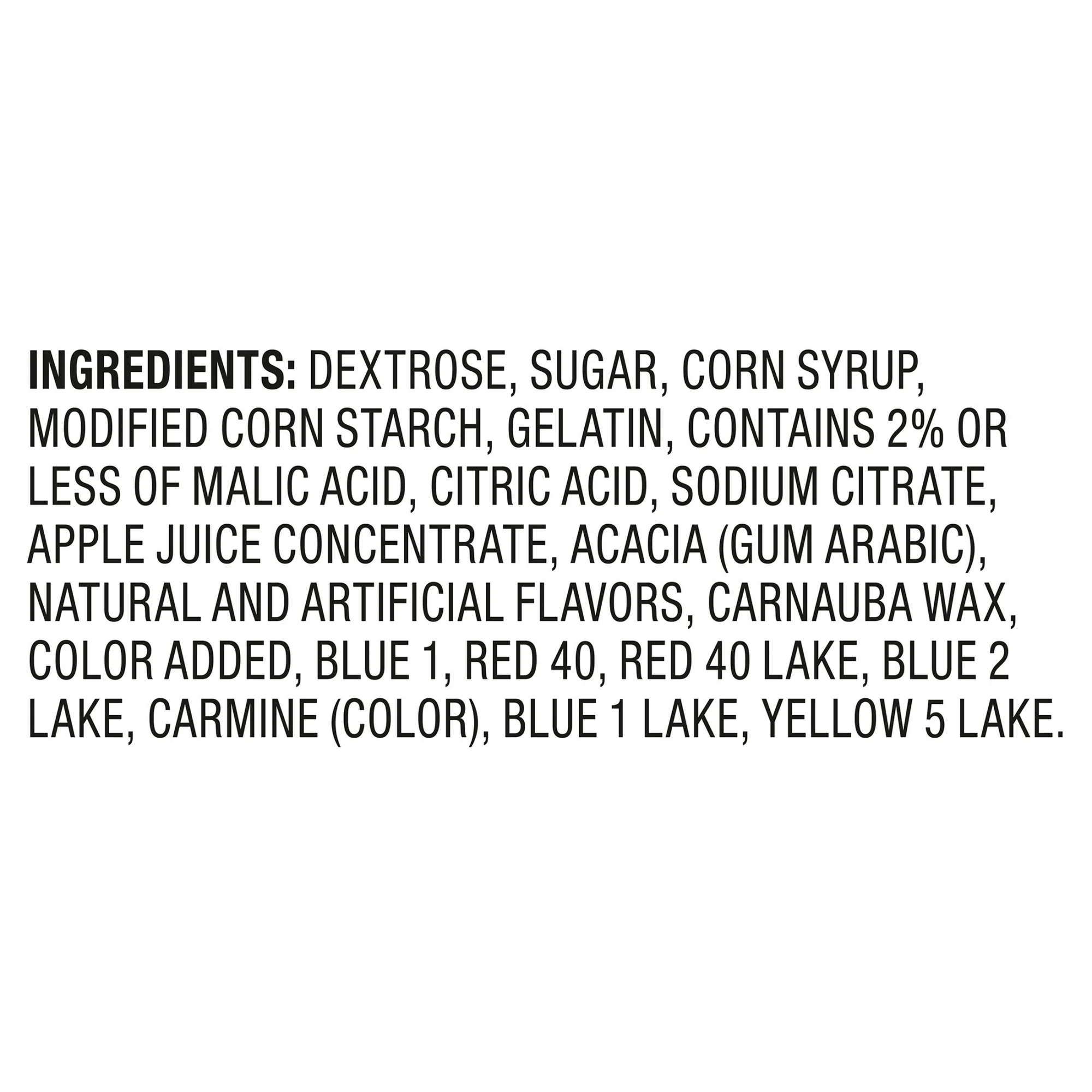 Dextrose, Sugar, Corn Syrup, Modified Corn Starch, Gelatin, Contains 2% or Less of Malic Acid, Citric Acid, Sodium Citrate, Apple Juice Concentrate, Acacia (Gum Arabic), Natural and Artificial Flavors, Carnauba Wax, Color Added, Blue 1, Red 40, Red 40 Lake, Blue 2 Lake, Carmine (Color), Blue 1 Lake, Yellow 5 Lake.