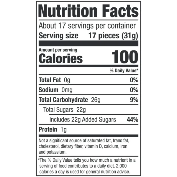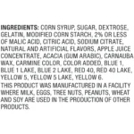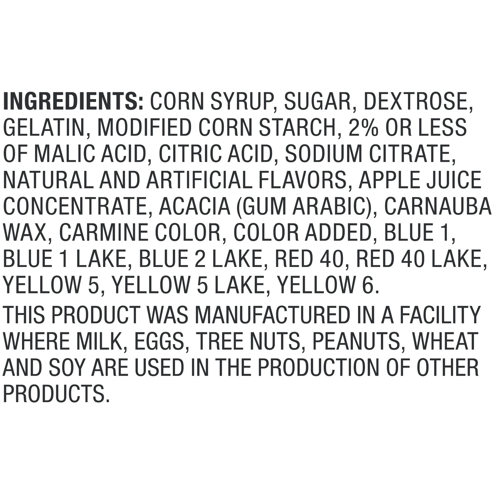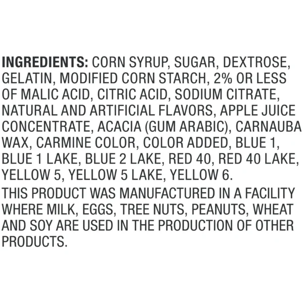 Dextrose, Sugar, Corn Syrup, Gelatin, Modified Corn Starch, Contains 2% or Less of Malic Acid, Citric Acid, Sodium Citrate, Apple Juice Concentrate, Acacia (Gum Arabic), Natural and Artificial Flavors, Carnauba Wax, Color Added, Red 40, Yellow 5, Red 40 Lake, Yellow 5 Lake, Blue 2 Lake, Yellow 6, Carmine (Color), Blue 1, Blue 1 Lake.